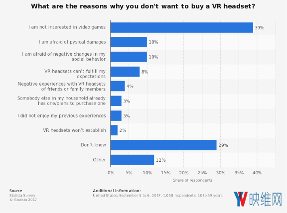 根据调查,消费者不愿意在2017年购买VR头显的主要原因是“我对游戏没兴趣”(39%),这表明大部分将VR头显等同于玩游戏。选择“害怕身体受伤”和“害怕对社交行为产生负面影响”的人数比例都是10%。另外,选择不知道的人数比例是29%。
