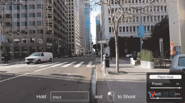 借助世界尺度的AR,整个城市都可以成为你的游乐场。这是演示应用程序中的一个实时画面,其中篮球可以识别建筑物,并在墙壁之间和汽车之间跳动