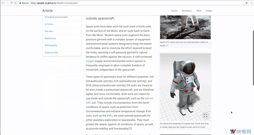 Article是适用于所有浏览器的3D模型查看器。在桌面端,用户可以通过拖动旋转或滚动缩放来浏览3D模型(本例为太空服)。手机端的体验相似:用户触摸并拖动旋转模型,或者用两根手指拖动放大。