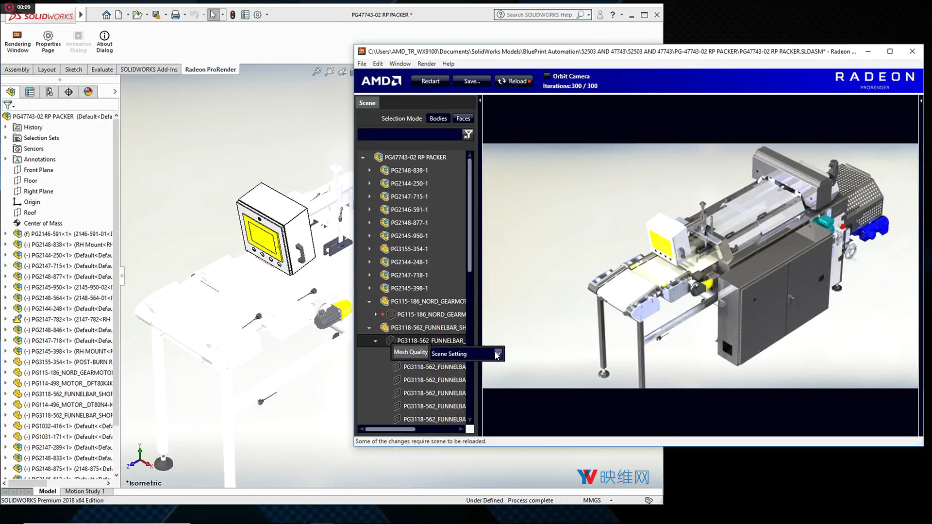 交互式体验对CPU、图形和内存的要求非常高,基本上涉及工作站的每一方面。SolidWorks用户基本上都是使用专业工作站硬件,比如Boxx的Apexx 4工作站,搭载16个核32线程的锐龙Thread Ripper 1950X CPU、32G内存 以及两枚Radeon Pro WX 9100显卡。但如果VR的图形几何任务过于繁重,即便是WX 9100这样的强大显卡都会陷入困境之中。因为这个原因ProRender增加了一个名为选择性抽取(selective decimation)的功能,能够智能地逐项或逐目录管理网格质量。