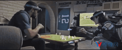 头显观赏的NFL体验同样是呈现出类似的体验。如图所示,HoloLens用户正在观赏呈现在桌面上的3D比赛片段。