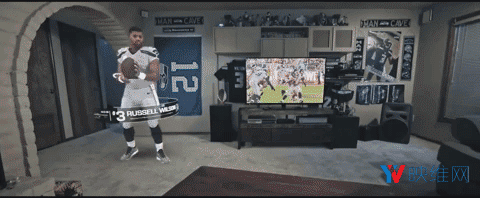 微软的NFL概念能够呈现真人大小的球员。只需轻轻挥动手指,HoloLens用户就召唤出了撞碎墙壁的跑卫马肖恩·林奇,或者是准备传球的四分卫罗素·威尔逊。