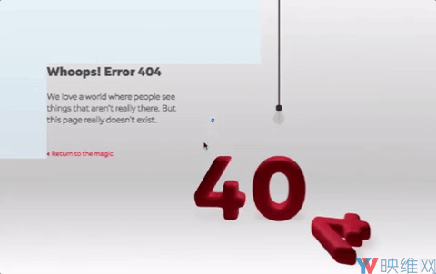 当你点击其中一个404错误页面时,你将会发现3D版“404”中的一个4倒在地下,而上面则是一闪一闪的灯泡。乍眼一看,这似乎只是经过精心设计的404页面,大多数人在看到这一页面后都会转身离开,不会多想。