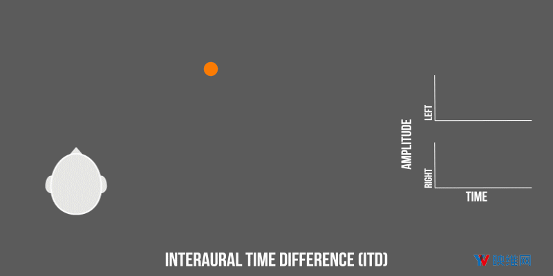 在一个示例中,枪声从右边传来。因为声音是以声波的形式传来,它首先是到达你的右耳,然后才是左耳。另外,声音到达左耳时的效能比右耳更弱。这种音量下降是源于声波的自然消散,以及你的头部吸收和反射了一定的声音。