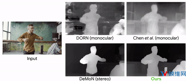 一种可能的方法是,分别为视频的每个帧推断深度(即,对模型的输入仅是单个帧)。尽管这种模型已经优化了用于深度预测的单图像方法,但我们可以通过考虑来自多个帧的信息来进一步改善结果。比方说运动视差,即两个不同视点之间的静态对象的相对明显运动,这可以提供强烈的深度线索。为了利用这些信息,谷歌计算视频中每个输入帧和另一帧之间的2D光流,后者表示两帧之间的像素位移。所述流场取决于场景的深度和摄像头的相对位置。但由于摄像头位置已知,谷歌可以从流场中移除它们的依赖关系,这能够产生初始深度图。所述的初始深度仅对静态场景区域有效。为了在测试时处理移动的人类对象,谷歌应用人工分割网络来掩模初始深度图中的人类区域。然后,所述网络的完整输入包括RGB图像,人类掩模,以及来自视差的掩模深度映射。