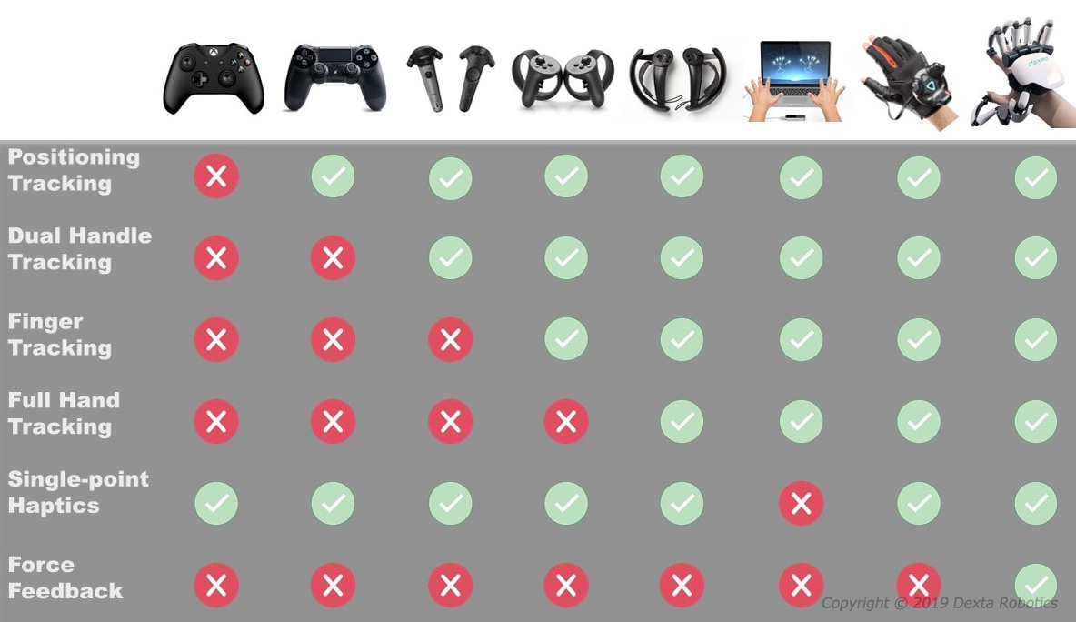 上图展示了VR中一些具有代表性的人机交互(HCI)工具,我不是按发布日期,而是基于功能来排序的。为了简单明了起见,我对每个功能都使用了“勾”和“叉”的简单标注,但这是不足以描述其中细微的差别的,为了完全理解它们,我会做进一步的解释。