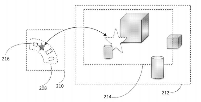 专利描述了用于提升增强现实体验的方法,系统和用户界面。 创建本地用户界面并将其显示在第一可见区域中。创建全局用户界面并将其显示在第二可视区域中,所述第二可视区域距用户比第一可视区域远。本地用户界面维持在第一空间位置,所述第一空间位置相对于用户身体一部分固定。全局用户界面维持在第二空间位置,所述第二空间位置相对于外部环境固定。