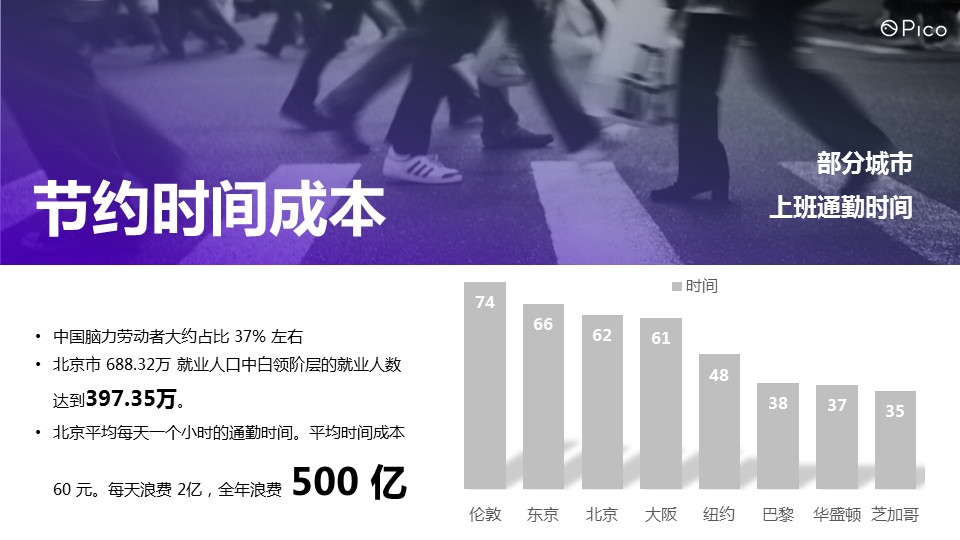 张明说:“第一,它会对我们的出行行业产生非常大的影响,可以解决我们的时间成本。给大家看一些数据,右边的图是部分城市的上班通行时间,可以看到北京平均每天需要1小时左右的上下班通勤。我们知道中国的脑力劳动占37%左右,就北京来说大概有300万左右的白领,这些人每天都要浪费一个小时在路上,按照北京平均工资来算一小时大约是60元,所以每年下来我们浪费在路上的时间成本就是500亿。第二,它可以降低每个人的出行成本,每天公交占50%左右的出行占比,平均每天公交5元,一年下来也是40亿的浪费,这还不算公交基础设施的投入。如果未来VR的办公兴起之后,可能市政就不会投入这么多在公交系统、地铁的修建上。第三,其实影响最大的是出行市场,现在中国的出行市场大约有6000亿左右,网约车市场1600亿左右,滴滴占90%的市场份额。我问过滴滴的朋友,他们说30%的人打滴滴是为了上下班通勤,如果VR兴起之后,就直接抢了他们30%的市场份额。这部分钱大家都可以花在VR设施上,这是高维打击,因为大家不需要再坐车。”