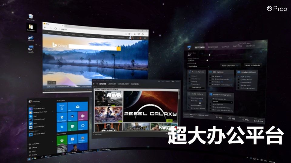 第四,在VR里办公效率会提升很多,VR是一个非常大的办公平台,比如很多人用笔记本时都希望公司给配一个大显示器,而在VR里不需要额外显示器可以直接在空间中放一个超大虚拟屏幕。