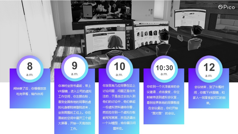 张明说:“想象一下,我们的VR办公兴起之后的场景。每天早上,你不用再去挤地铁,在家吃完早餐。休息到了9点钟就到办公桌前戴着头显耳麦,你可以立刻走过去跟他们进行沟通。想开会的时候,可以把在全球各地的同事立刻拉到虚拟会议中进行信息的交流。中午可以继续与家人进行午餐,这是一个完全不一样的场景。”
