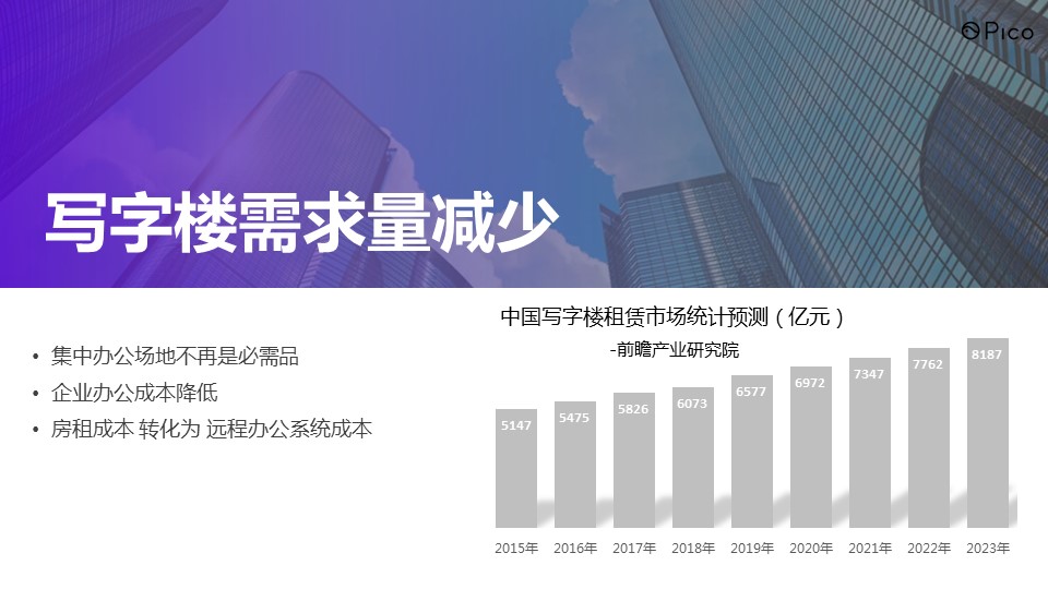 张明说:“首先我觉得写字楼的市场需求量会极大地减少。右边的图是我在网上找的现在写字楼租赁市场的预测,2018年中国写字楼租赁在6000亿左右的市场规模,如果再过十年二十年,VR在家办公兴起之后,集中办公的场地就不再是必需品,所以企业的办公成本就会降低,接近6000亿的投资成本将会转移到对VR的管理硬件或云平台的采购上。[如果]我要开一家网络公司,可能需要在阿里云上采购网站和服务设施,而未来开一个公司可能是需要在阿里云上采购远程办公的虚拟空间来,这些成本最终都会转移到VR产业中。”