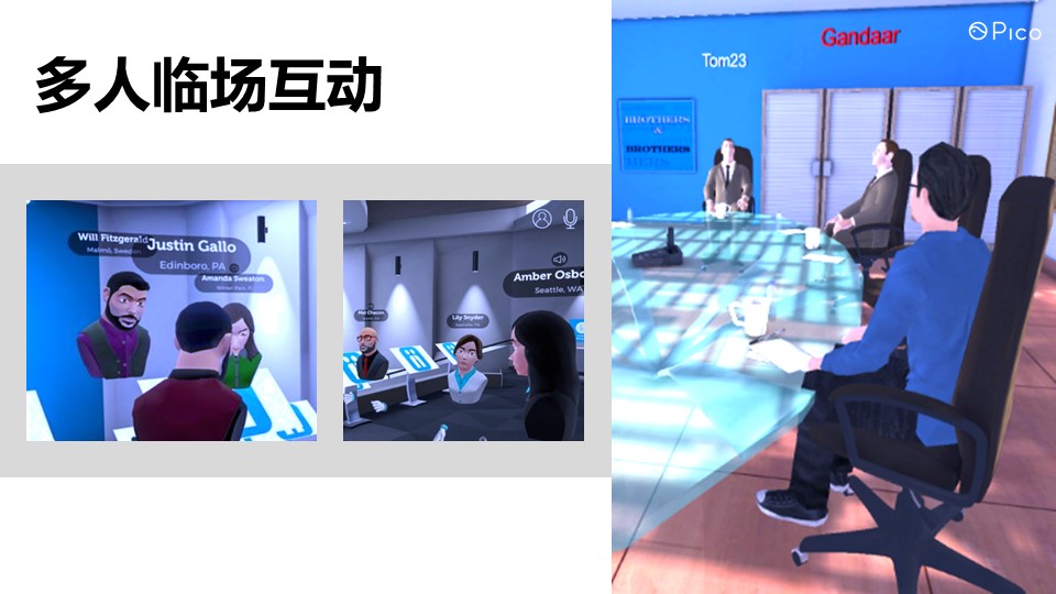 第三,VR可以进行大场景多人互动,将所有员工置于同一个办公场景,实现一个令人放松且能达到有效管理监督的场景。