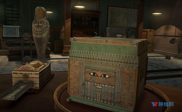 经历过一系列复杂的谜题,包括失踪的鲁珀特·蒙哥马利博士的幽灵般幻影之后,我设法利用精心设计的绳索和滑轮系统将大石盒拖到房间中间。通过切换房间后面的几个齿轮,我打开了盒子。相关的动作令人感到非常满意。得益于流畅的音效和身临其境的音频,即使是体力劳动的声音都感觉非常真实。最后,我的努力得到了回到。我发现了一个搁在石架内的金玉石棺材。