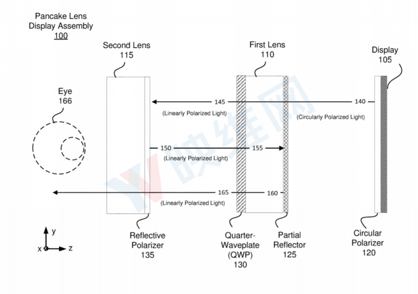 专利描述的头显显示器组件包括Pancake透镜显示器组件。Pancake显示组件包括具有四分之一波片和部分反射表面的第一透镜、具有反射偏振器的第二透镜和显示器。