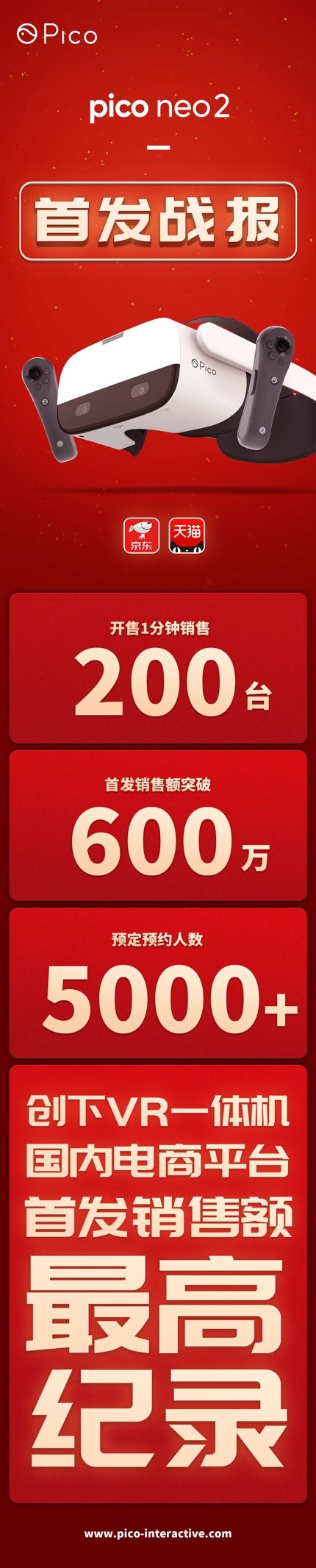 Pico表示:“Pico Neo 2 在京东天猫两个平台总预约数超过5000人次,开售一分钟即售出200台。截至3月27日24点整,总销售额突破600万,创下了国内VR一体机电商平台首发销售额最高记录。从京东排行榜来看,在开售后的Pico Neo 2 仅用3天就登上了VR眼镜热卖榜Top 1。作为一款售价逾4000元的高单价旗舰产品,可以取得这样的成绩着实亮眼,也说明Pico品牌实力确实得到了用户的认可。”