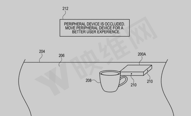 但专利的关键在于,如何根据所渲染的AR图像以及设备与用户的关系来改变类触控板的设备应用。触控板和头显的结合意味着系统可以告知用户重新定位外围触控设备。为了达到最佳的操作效果,外设可以要求在其附近周围留出额外的空间,这样摄像头传感器就不会受到遮挡。错误信息可以显示在头显之中,而用户可以将触控板移动到更佳的位置来进行清除。