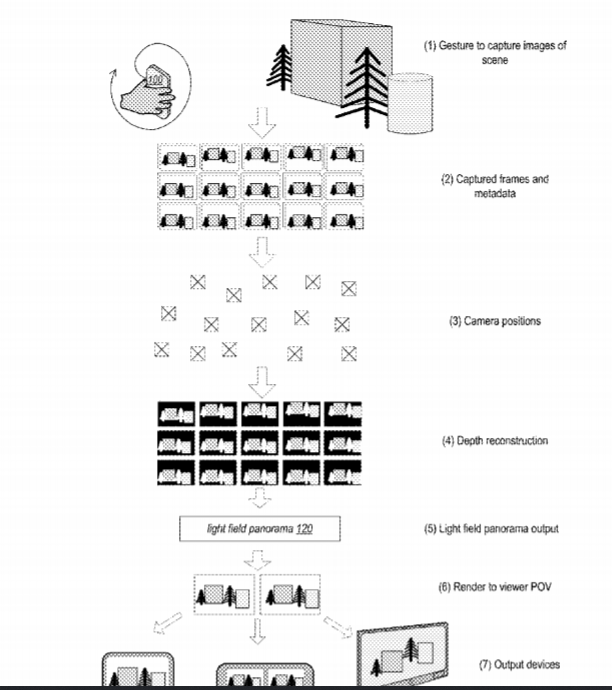 专利描述了一种光场全景系统。在所述系统中,手持移动设备的用户通过手势从不同位置捕捉场景的图像。系统同时可以捕获附加信息,如位置和方向信息。可以对图像和信息进行处理,以确定包括相对位置和深度信息的元数据。图像和元数据可以存储为光场全景图。光场全景图可以由渲染引擎进行处理,以渲染场景的不同3D视图,并允许用户以六个自由度从不同的位置和角度探索场景。利用诸如移动设备或头显的渲染和浏览系统,用户可以看到场景的不同部分。