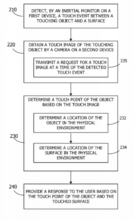 触碰检测可以包括,根据第一设备的IMU的数据来确定触碰事件,其中触碰事件指示触碰对象和表面之间的接触;获得由第二设备捕获的深度图像;确定对象的触碰点基于触深度图像,并提供基于对象触摸点和触碰表面的响应。