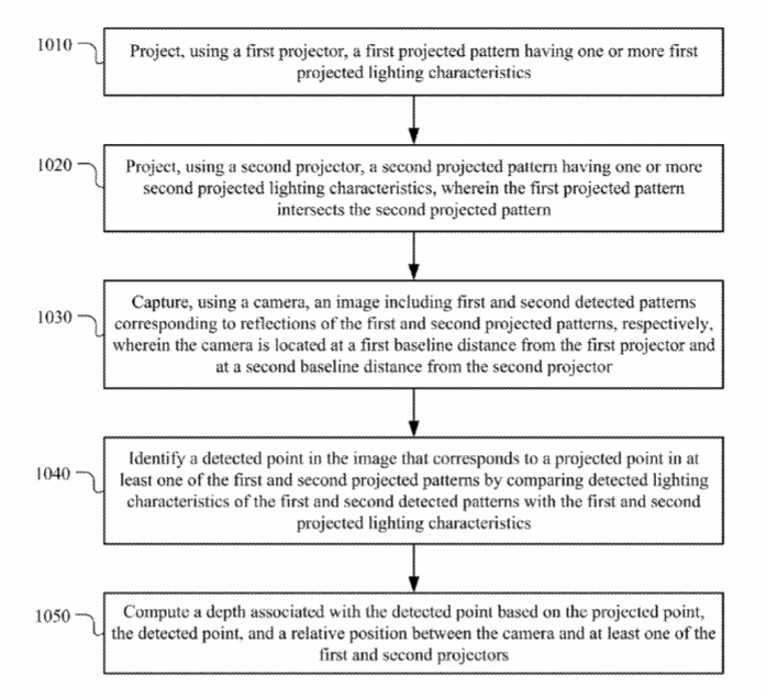 在一个实施例中,系统包括配置成投射具有一个或多个第一投射照明特性的第一投射器;配置成投射具有一个或多个第二投射照明特性的第二投射器;以及摄像头,所述摄像头配置成捕捉分别包含与第一和第二投影图案的反射相对应的第一和第二检测图案图像。系统同时包含一个或多个处理器,所述处理器配置为:将第一和第二检测图案的照明特性与第一和第二投影照明特性进行比较,从而识别图像中与第一和第二投影图案中的至少一个投影点相对应的检测点,然后根据投影点,检测点,以及摄像头与至少一个投影仪之间的相对位置来计算深度。