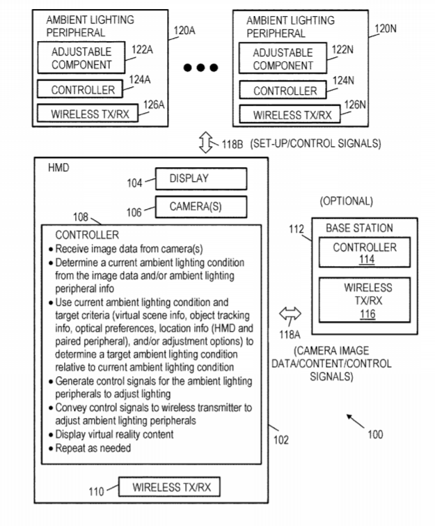 专利描述的设备包括收发机和与收发机通信的控制组件。控制组件配置成相对于房间中的当前照明条件来确定房间中的目标照明条件。控制组件同时配置成生成控制信号,所述控制信号具有根据目标照明条件来调整环境照明外设的指令。控制信号提供给收发器进行传输。
