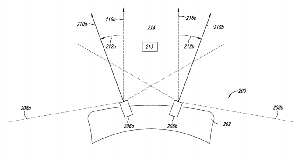 专利描述的场景摄像系统包括两个或多个反射系统前视场中的相应部分光线的反射镜,以及两个或多个分别捕捉两反射光线的摄像头。利用反射镜反射光,摄像头的入射光瞳成像到更靠近用户眼睛的位置,从而实现用户视角的更精确表示。