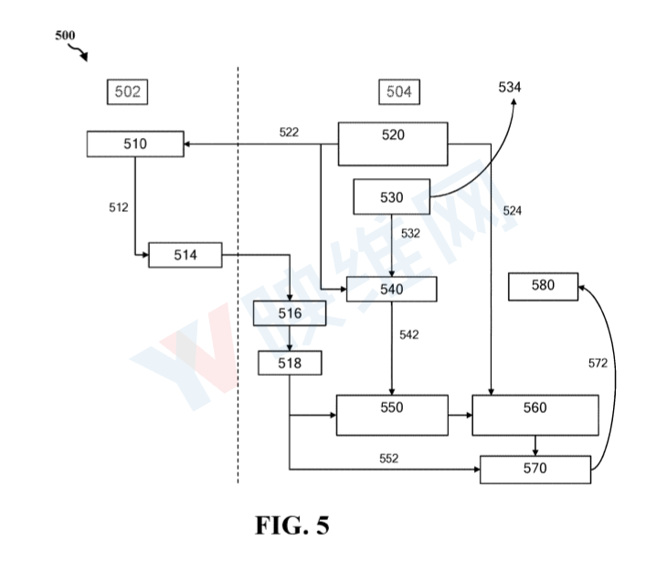 图5是内容生成和编码系统500的一个实施例。更具体地说,图5是异步空间扭曲(ASW)生成和编码系统的一个示例。如图5所示,系统500包括服务器502和客户端504。服务器502包括渲染器510和编码器514。客户端504包括解码单元516、解码帧518、头部追踪系统520、缓冲器530、异步时间扭曲(ATW)单元540、运动矢量计算单元550、运动矢量滤波和外推单元560、扭曲单元570和显示单元580。