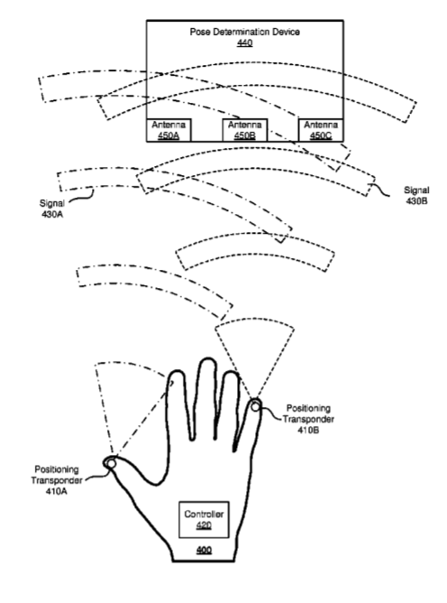 专利描述的一种系统包括可定位手套和姿势确定组件。可定位手套包括手套主体和多个定位应答器。定位应答器在耦合到手套主体,并且每个都重新发射接收到的信号。姿势确定组件包括多个天线和控制器件。每个天线都配置为接收由定位应答器重新发射的信号。天线彼此分开。控制器件通信地耦合到多个天线。
