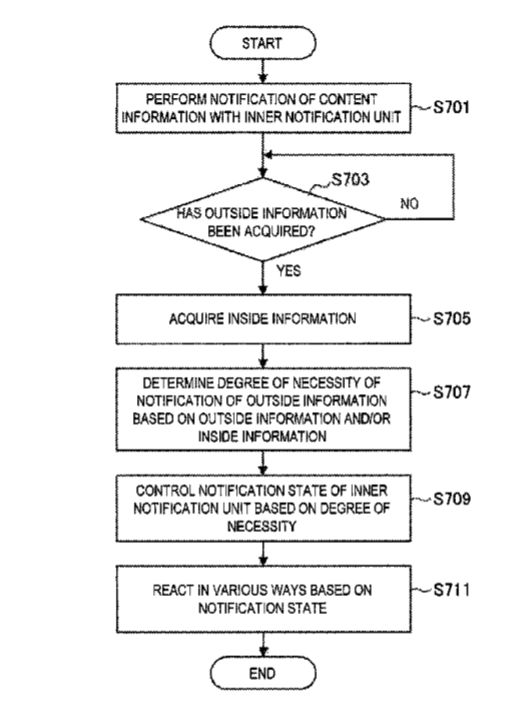 专利描述的信息处理装置包括:必要性程度确定单元和通知状态控制单元。必要性程度确定单元配置为根据用户外部信息确定向用户通知所述信息必要程度。通知状态控制单元配置为根据确定的必要性程度切换外部信息的通知状态。
