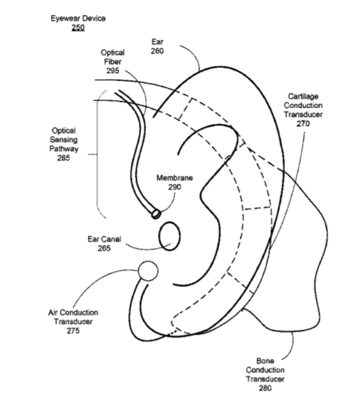 专利描述的音频系统包括换能器组件、光学传感通路、激光器、检测器组件和控制组件。换能器组件耦合到用户耳朵,并根据音频指令产生声波压力波。光学传感通路至少部分地随着检测到的声波压力波而移动。激光器发出的光分离成参考光束和传感光束,参考光束耦合到光学传感通路中。检测到的声波压力波与传感光束相互作用以改变光路长度。检测器组件从光学传感通路检测参考光束和传感光束,并根据参考光束和传感光束之间的光路长度变化来测量检测到的声波压力波。控制组件根据声波压力波的测量结果调整音频指令。
