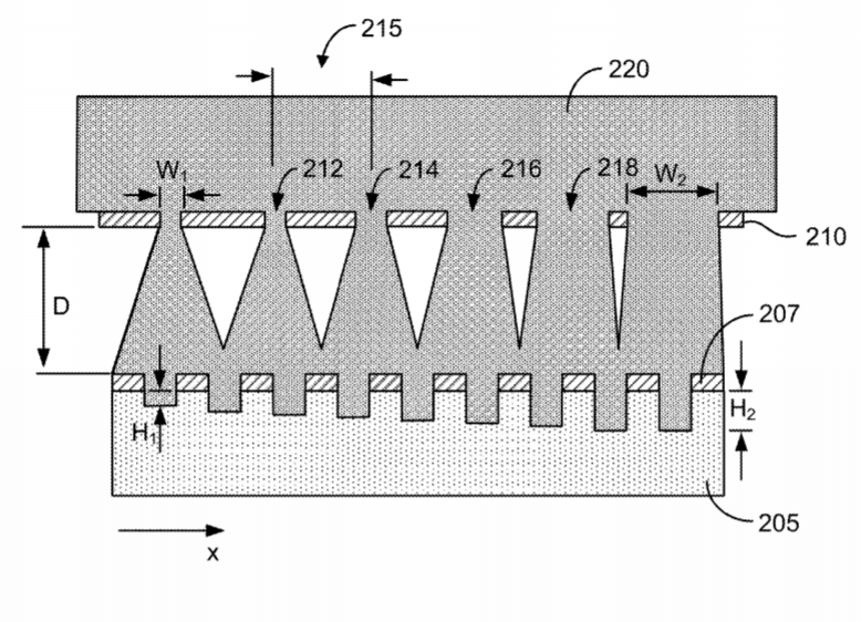 专利描述了一种制造具有不同衍射元件深度的衍射结构,所述方法包括提供阴影掩模,所述阴影掩模含有具有第一孔径尺寸的第一区域,以及具有第二孔径尺寸的第二区域。所述方法同时包括将阴影掩模定位于基板附近。基板包括对应于衍射结构的蚀刻掩模。所述方法还包括将基板暴露于蚀刻剂,通过蚀刻基板以形成与第一区域相邻的衍射元件;通过蚀刻基本以形成与第二区域相邻的衍射元件,第二区域具有小于第一区域的第一深度的第二深度。