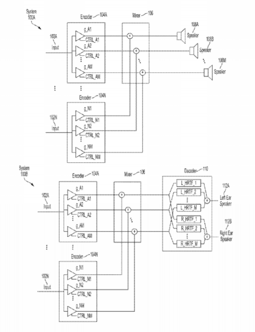 专利描述了向头显用户呈现音频信号的系统和方法。根据一个实施例的方法,确定与音频信号对应的源位置。确定与音频信号相对应的声学轴。对于用户左耳和右耳中的每一个,确定其与声学轴之间的角度。对于用户左耳和右耳中的每一个,在虚拟扬声器阵列中确定一个虚拟扬声器位置。虚拟扬声器阵列包括多个虚拟扬声器位置,多个虚拟扬声器位置中的每个虚拟扬声器位置位于与用户头部同心的球体表面之上。对于用户左耳和右耳中的每一个,确定对应于虚拟扬声器位置的头相关转移函数(HRTF);根据确定的角度确定一个源辐射滤波器;处理音频信号以产生用于耳朵的输出音频信号;以及通过一个或多个扬声器向用户耳朵呈现输出音频信号。处理音频信号,包括对音频信号应用HRTF和源辐射滤波器。