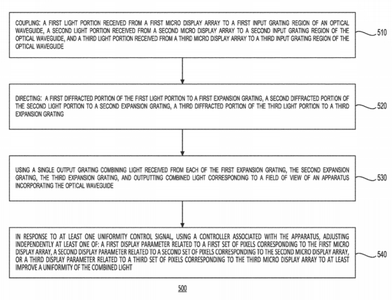 专利描述了具有单板光波导和可独立调节微显示器阵列的显示系统及相关方法。一种方法包括:将从第一微显示器阵列接收的第一光线部分耦合到光波导的第一输入光栅区域;将从第二微显示器阵列接收的第二光线部分耦合到光波导的第二输入光栅区域;以及从第三微显示器阵列接收的第三光线部分耦合到光波导的第三输入光栅区域。所述方法同时包括:将第一光线部分的第一衍射部分引导至第一扩展光栅,将第二光部分的第二衍射部分引导至第二扩展光栅,以及将第三光部分的第三衍射部分引导至第三扩展光栅。