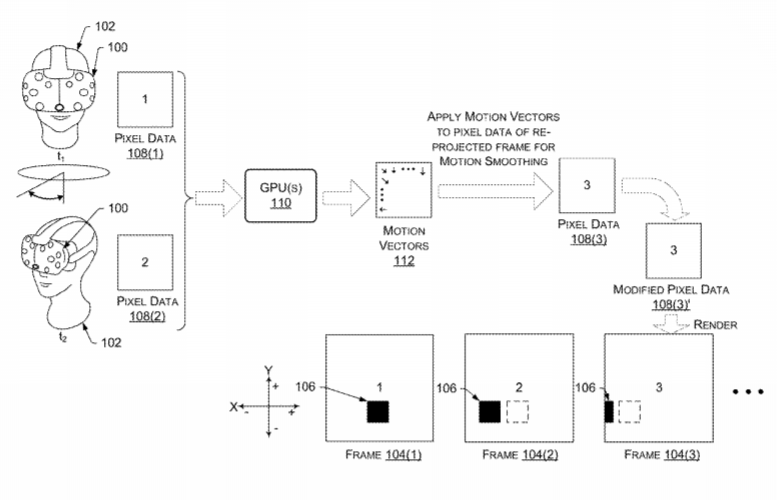 专利描述了用于显示系统的运动平滑技术。例如,可将与两个先前渲染帧相关联的第一像素数据和第二像素数据作为输入,并提供给GPU。GPU的视频编码器可以处理输入的像素数据并生成运动向量数组,所述运动向量数组用于修改再投影帧的第三像素数据。修改后的第三像素数据可实现“运动平滑化”,并由显示器进行渲染,从而减轻运动或动画对象的抖动。