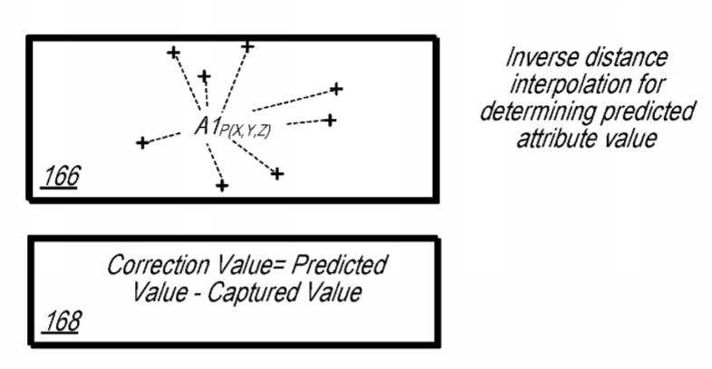 专利描述的系统包括配置为压缩点云的属性信息和/或空间信息的编码器,和/或配置为解压点云的压缩属性和/或空间信息的解码器。至少一个起始点的属性值包含在压缩的属性信息文件中,并且属性修正值包含在压缩的属性信息文件中。属性值至少部分地根据相邻点的属性值来预测属性值。将预测的属性值与压缩前的点云属性值进行比较,从而确定属性修正值。为了提高计算效率和/或可重复性,在确定预测的属性值和属性修正值时使用固定点数表示法。解码器遵循与编码器相似的预测过程,并使用属性修正值和固定点数表示法对预测值进行修正。