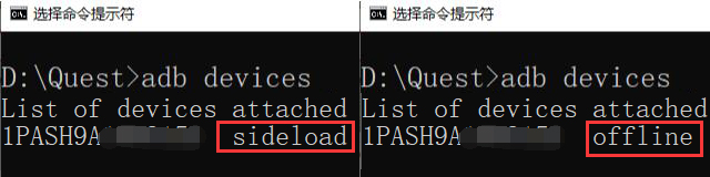 :确认Quest adb模式是否正确连接,在命令行输入“