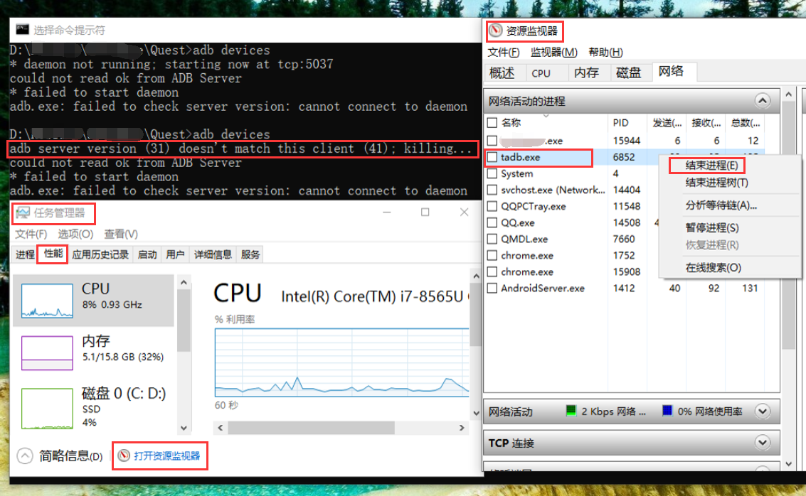 的进程,该进程导致我的Quest adb固件升级一直失败,最后我在终止结束该进程后就顺利完成了升级更新。(任务管理器 —> 性能 —> 资源监视器 —> 网络活动进程,找到其他adb进程,鼠标右键单击,在弹出菜单中选择“结束进程”。)