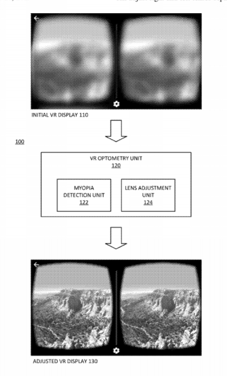 专利描述的虚拟现实头显系统包括视觉矫正模块。所述视力矫正系统可以检测出VR系统用户的近视程度或其他视觉疾病,然后调整视力矫正镜片,从而适应用户的近视情况。