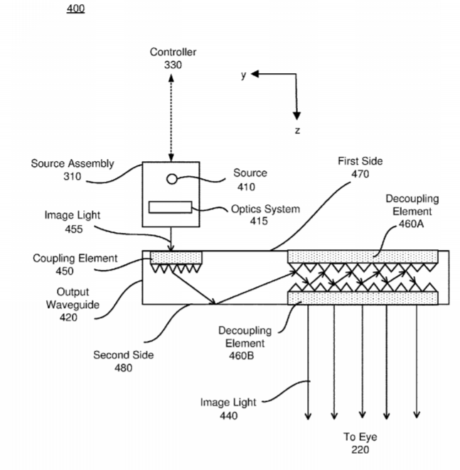 专利描述的波导显示器用于向用户呈现媒体内容。波导显示器包括光源组件,输出波导和控制组件。光源组件包括至少沿一个维度投射图像光的一个或多个投影仪。输出波导包括具有两个相对表面的波导体。输出波导包括:第一光栅,接收沿输入波矢传播的图像光;第二光栅;以及第三光栅,第三光栅与第二光栅相对,并输出具有与输入波矢相匹配的波矢扩展图像光。控制组件控制一个或多个源组件的扫描以形成二维图像。