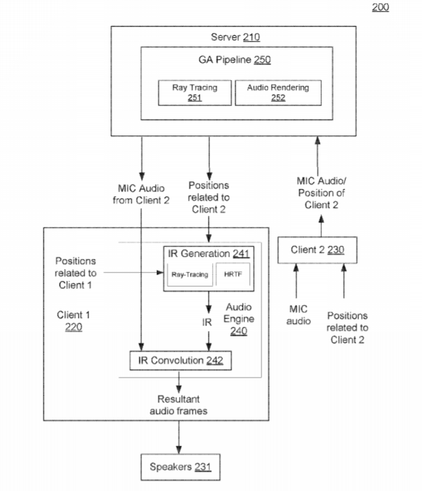 专利描述了一种虚拟现实音频呈现系统和方法,其包括根据VR设置将捕捉到的真实世界声音空间化的麦克风。在游戏流媒体系统中,当玩家通过麦克风讲话时,通过为虚拟场景配置的几何声学模拟来处理语音,从而添加特定于场景的空间音频效果。算法模拟可以包括使用声音传播模拟和基于动态HRTF的侦听器方向生成脉冲响应。当播放经过几何声学处理的播放器声音时,本地玩家或其他玩家可以听到它,就像声音是在场景中传播一样。