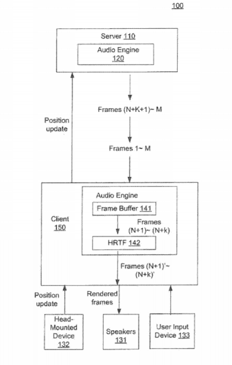 专利描述了一种虚拟现实音频呈现系统。在虚拟现实系统中,当检测到用户位置变化时,客户端根据新位置确定适当的HRTF,并将其与服务器基于先前位置生成的一组音频帧进行卷积,从而产生用于渲染的修改帧。同时,客户端将新的位置传播到服务器,以生成用于校正位置的后续音频帧。