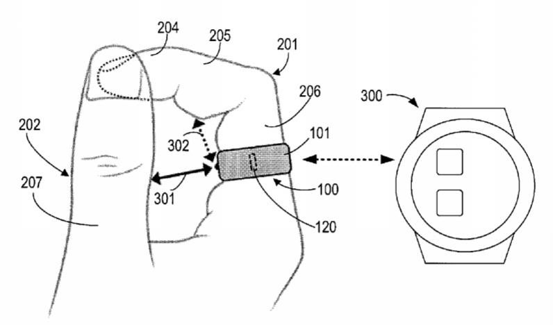 专利描述的可穿戴设备通常包括第一传感器、第二传感器和控制组件。第一传感器可以检测用户第一个手指的第一组一个或多个运动。所述第二传感器能够检测用户第二手指的第二组一个或多个运动。控制组件配置成根据第一和第二运动组确定第一手指和第二手指之间的相对运动,从而检测多指手势,并且控制与基于多指手势的可穿戴设备相关联的终端设备。