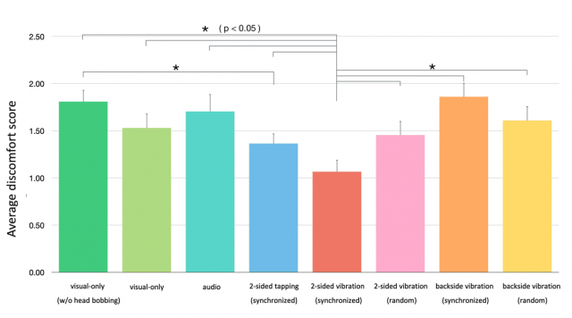 。另外,与所有其他条件相比,步履同步型的双侧振动触觉提示的能够显著降低不适感,并且提高了真实感,这包括基于轻敲的反馈。