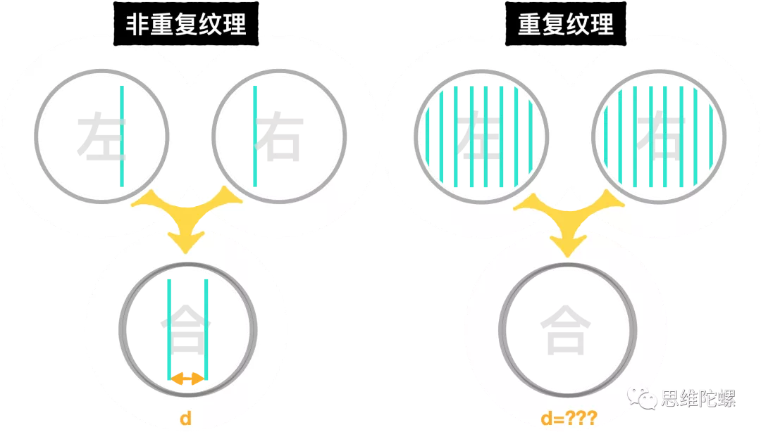 人眼双目计算深度是根据视觉特征来合像,并通过偏移量(disparity)来感知深度。偏移量越大,说明距离越近;偏移量为零,说明距离为无限远。但对重复纹理进行合像时,有多个不同的偏移量(disparity)可能性,也就能感知出多个不同的深度,导致出现深度感知错乱。