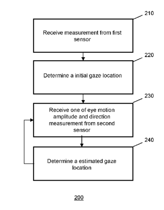 专利描述了一种追踪眼球运动的方法。所述方法的一个实施例包括从配置成检测注视位置的第一传感器接收第一测量,至少基于第一测量确定初始注视位置,从第二传感器接收眼动幅度和眼动方向测量中的至少一个,以及至少基于初始注视位置和眼动幅度和眼动方向中的至少一个来确定估计的注视位置。