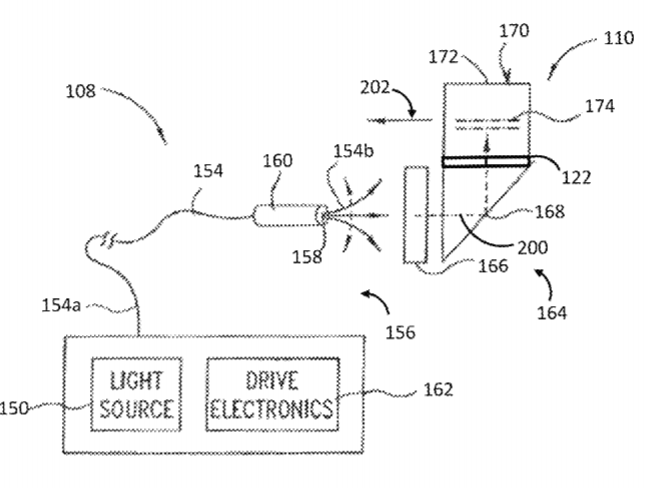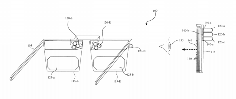 专利描述了一种MicroLED显示系统,所述系统包括多个单色投影仪(如三个MicroLED投影仪)以产生三个单色图像(如红、蓝、绿图像。所述图像分别输入到头显的单一波导中,并组合成一个图像显示给用户。通过利用包括多个空间分离的输入区域(如用于输入蓝光的区域、用于输入红光的区域、用于输入绿光的区域)的单一波导,MicroLED显示系统可以减少头显的形状参数。