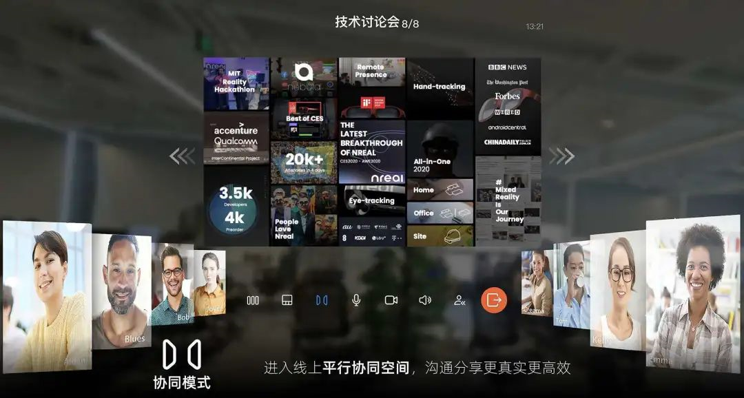 而借助Nreal就能够为用户即时创建一个虚拟的办公空间,线上连接不同地点办公的员工实现空间的跨越。