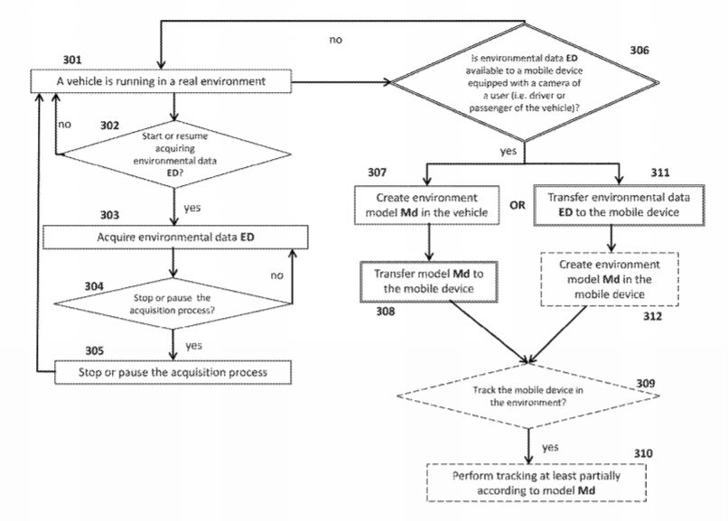 对于在真实环境中追踪包括至少一个摄像头的移动设备,所涉及的步骤包括:接收与由至少一个摄像头捕获的至少一个图像相关联信息;根据至少一个传感器获取的环境数据或移动系统状态数据,生成真实环境至少一部分的几何模型;并且根据与至少一个图像相关联信息执行追踪过程。专利同时描述了利用至少一个摄像头提供的图像信息来生成真实环境至少一部分的几何模型。