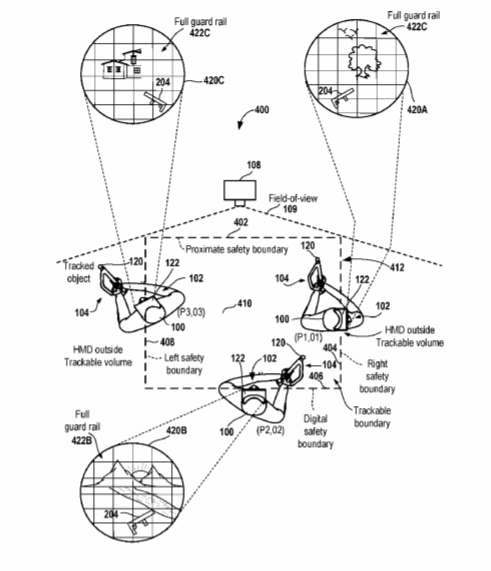 专利描述了用于说明用户超出边界的系统和方法。所述方法包括由摄像头生成视场,所述视场包含定义体三维的多个边界。所述方法同时包括由摄像头捕获头显的一个或多个图像。所述方法包括由处理器从一个或多个图像中识别头显在真实世界环境中的位置。所述方法包括由处理器确定所述位置的头显是否已经越过边界。所述方法包括,在确定已经越过边界之后,生成包括护栏的一个或多个视频帧,并将一个或多个视频帧发送到头显以进行显示。