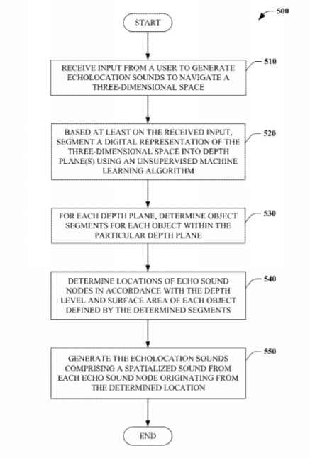 专利描述了用于生成回声定位声音的系统,所述系统可以帮助没有视觉或有限视觉的用户导航三维空间。从用户接收输入,生成回声定位声音以导航三维空间。根据接收到的输入,使用无监督机器学习算法将三维空间的数字表示分割成一个或多个深度平面。对于每个深度平面,为特定深度平面内的每个对象确定对象分段。根据由所确定的段定义的对象深度水平和表面积来确定多个回声节点的位置。生成包含回声节点的空间化声音的回声定位声音。