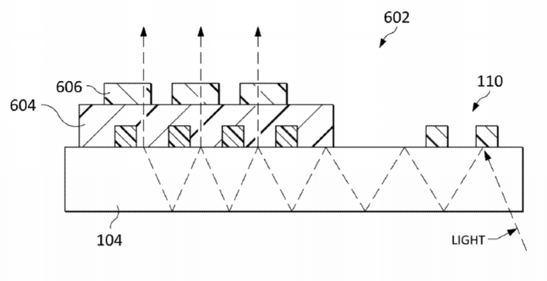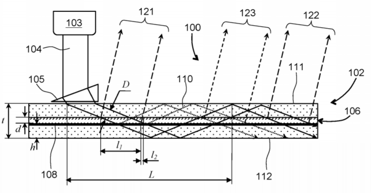 专利描述的波导包括具有两个外表面的基板,其用于通过反射来自外表面的光束而在基板中传播图像光。衍射光栅由基板支撑,并配置成对光束进行衍射。部分反射器设置在第一和第二表面之间,且平行于第一和第二表面的基板。部分反射器配置成分裂光束,增加波导中光束部分的数量,从而提高输出光瞳密度。